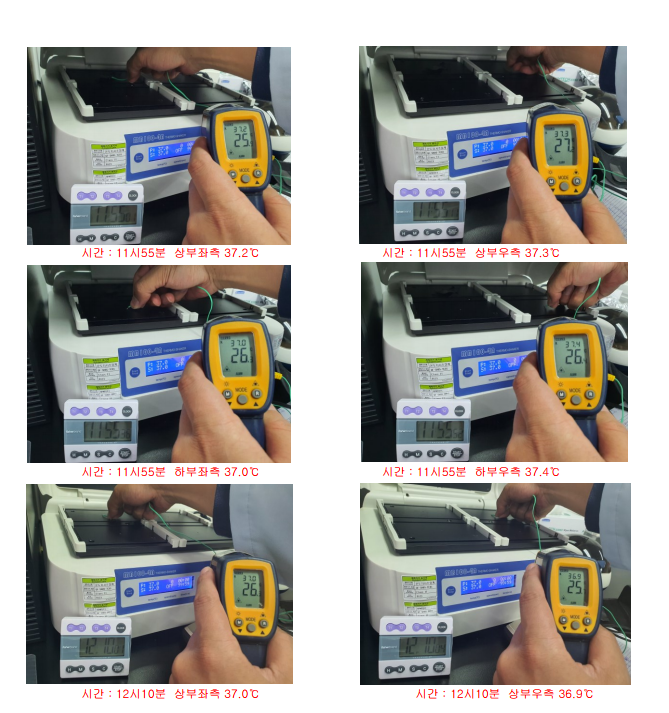 가열판 4곳 모두 37℃를 기준으로 ±0.5℃ 범위 안에 있다는 것을 확인하실 수 있습니다.