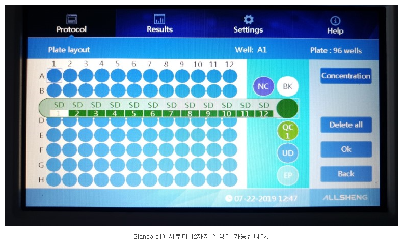 Standard 를 통한 분석값을 얻기 원하신다면, Standard (SD초록버튼)을 눌러 지정하고 이외의 Blank (BK 흰색)값과