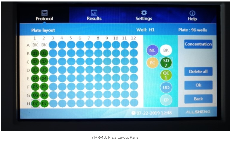Layout : 96 wellplate 의 well 위치마다 샘플의 특성 (standard, sample, blank...) 등 저장이 가능한 화면으로 이동이