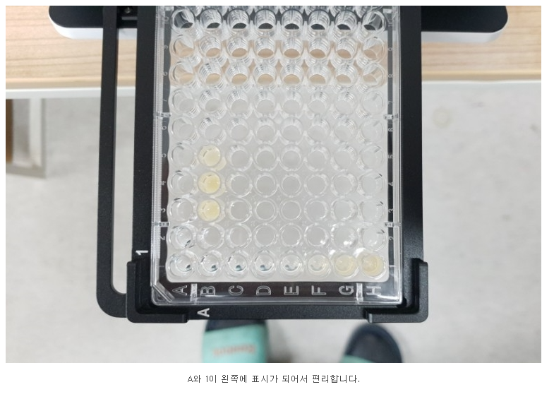 아래 보시는 사진과 같이, 96well plate 에는 A~H / 1~12 까지의 숫자, 알파벳으로 표기가 되어 있습니다.