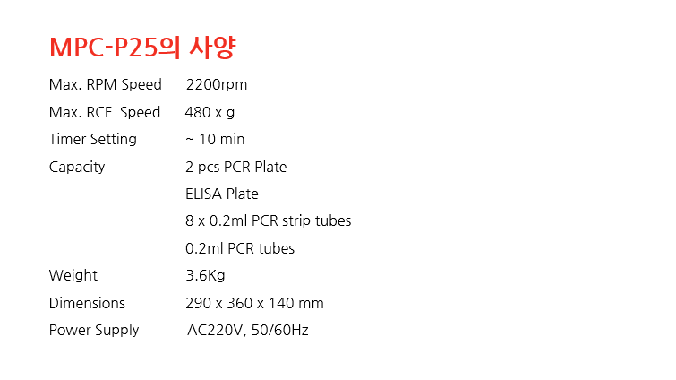 MPC-P25 제품은 Plate 를 간단하게 원심력을 이용하여 Spin Down을 해주는 Plate 전용 원심분리기 입니다.