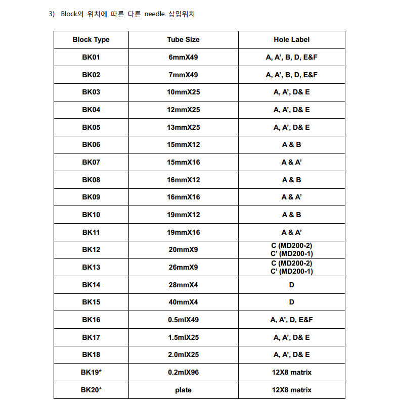 타사 제품의 경우는 한번 블럭을 정하면 고정된 메뉴폴터 때문에 needle 위치가 고정되기 때문에 추가로 다른 용기를 사용하실 경우에는 비용이 많이 들게 되는 단점이 있지만, MD200-2 는 이런 부분에 대해서 걱정없이 다양한 블럭들을 호환하여 사용이 가능합니다.