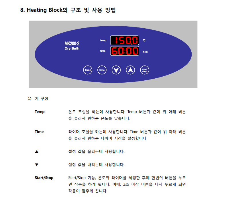 하단부에 있는 Main Heating Block (= Dry Bath Incubator) 그리고 스탠드,