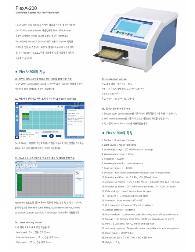 그리고 96well 과 384well 두가지 측정이 가능하며, Shaking, 인큐베이션 기능도 있습니다.