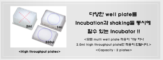 각종 Microplate 들을 온도와 회전을 제공하여 Incubation 과 Shaking 을 각각 혹은 동시에 수행할 수 있습니다.