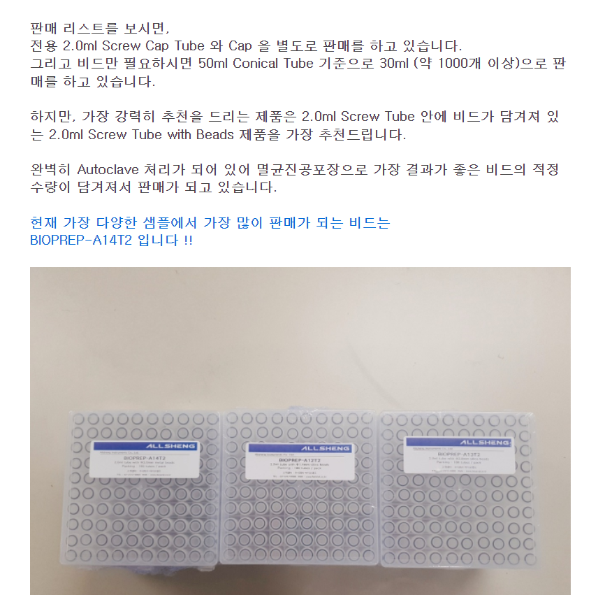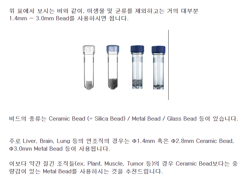 Bead를 이용해서 샘플을 파쇄하기 때문에 사용되는 비드는 샘플에 따라서 아래의 표와 같습니다.