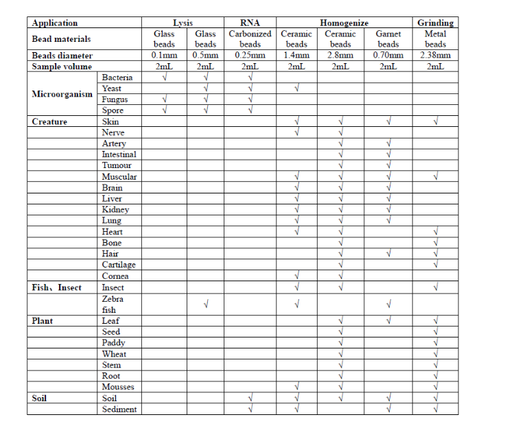 Bead 를 이용해서 샘플을 파쇄하기 때문에 사용되는 비드는 샘플에 따라서 아래의 표와 같습니다.