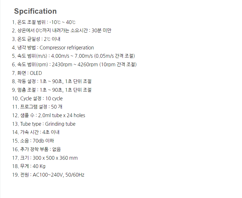 Bead Homogenizer : 냉장기능이 포함되어 별도의 추가 악세사리없이 -10℃까지 온도 조절이 가능하기 때문에 RNA, Protein과 같은 온도에 민감한 샘플에 적용이 가능합니다.
