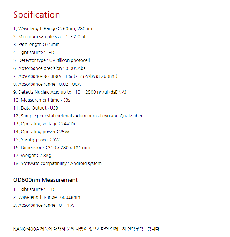260nm, 280nm 두가지 파장 측정 가능한 저가형 Drop형 spectrophotometer 제품으로 DNA, RNA, Protein, OD600 측정 가능합니다.